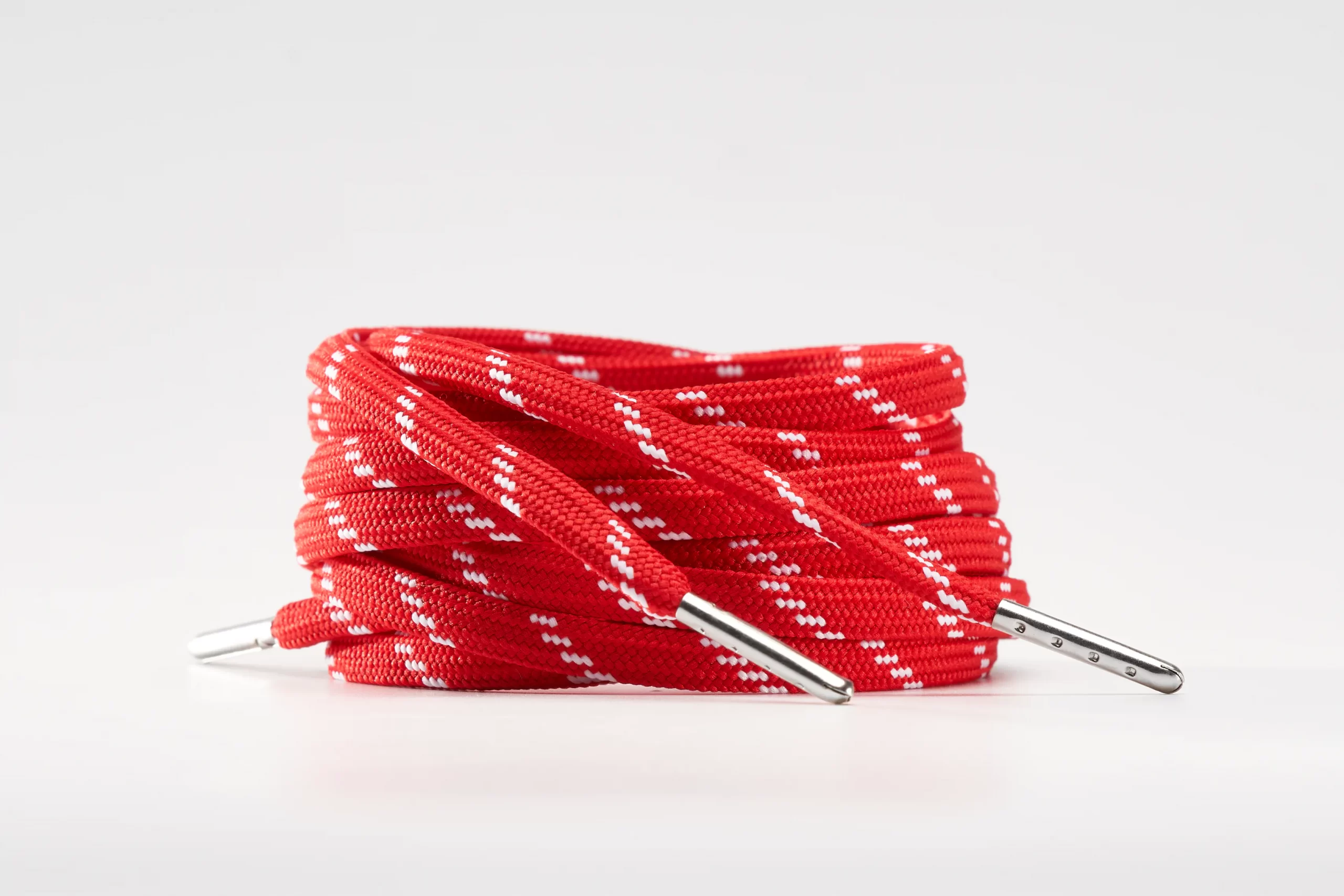 Flat durable, high quality shoelaces 7mm Red with dots 155cm(61”) for sneakers or boots with 9 holes. The shoelaces come with silver metallic endings. Made of 100% recycle polyester.