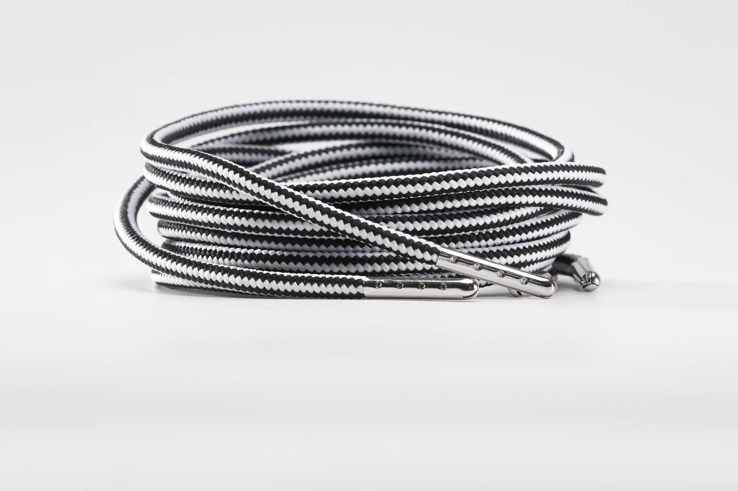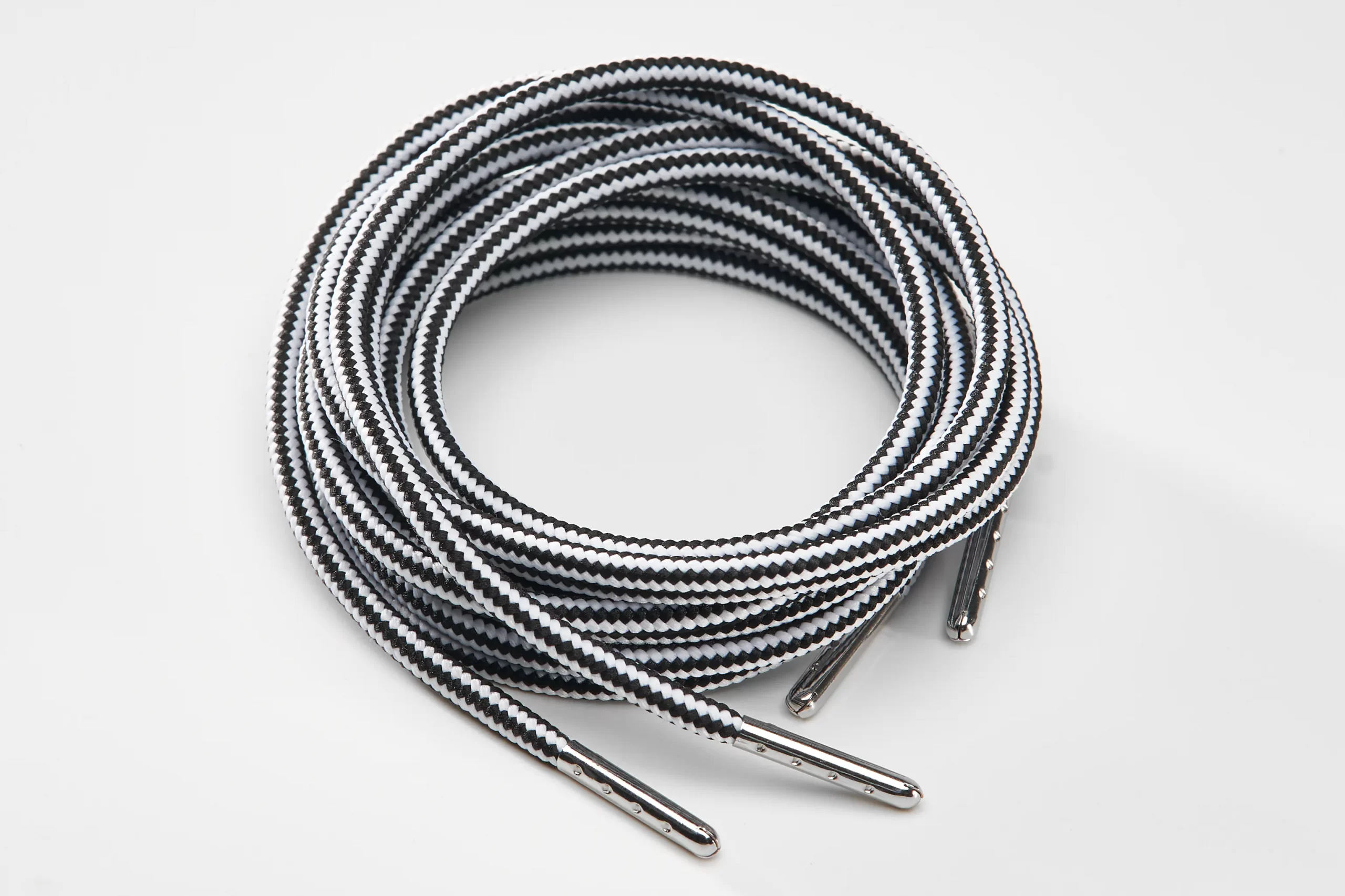 Round durable, high quality shoelaces 4mm black-white with stripes 135cm(54”) for sneakers or boots with 8 holes. The shoelaces come with silver metallic endings.