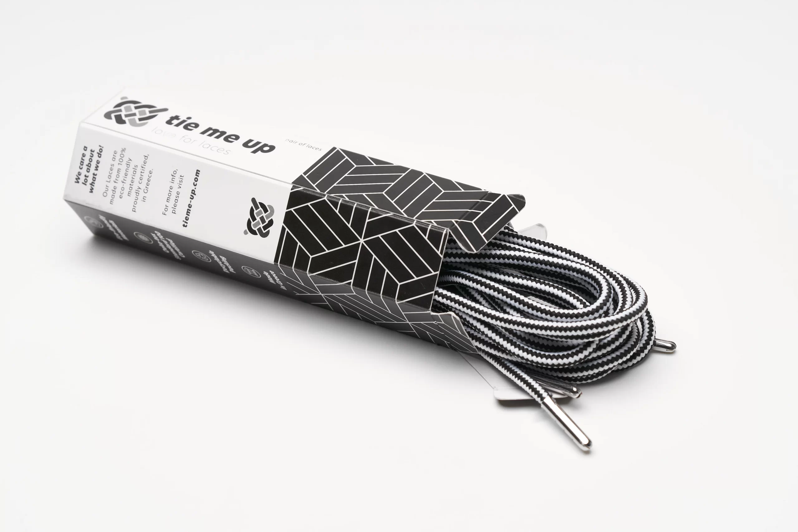 Change your shoelaces with fashion shoeleces from tieme-up and update your style to the next level.Create unique combos that stand out.Its time to complete your own style and tie your shoes up with premium fashion shoelaces.Round shoelaces 4mm black-white with stripes 135cm(54”). OEKOTEX certified and made in Greece