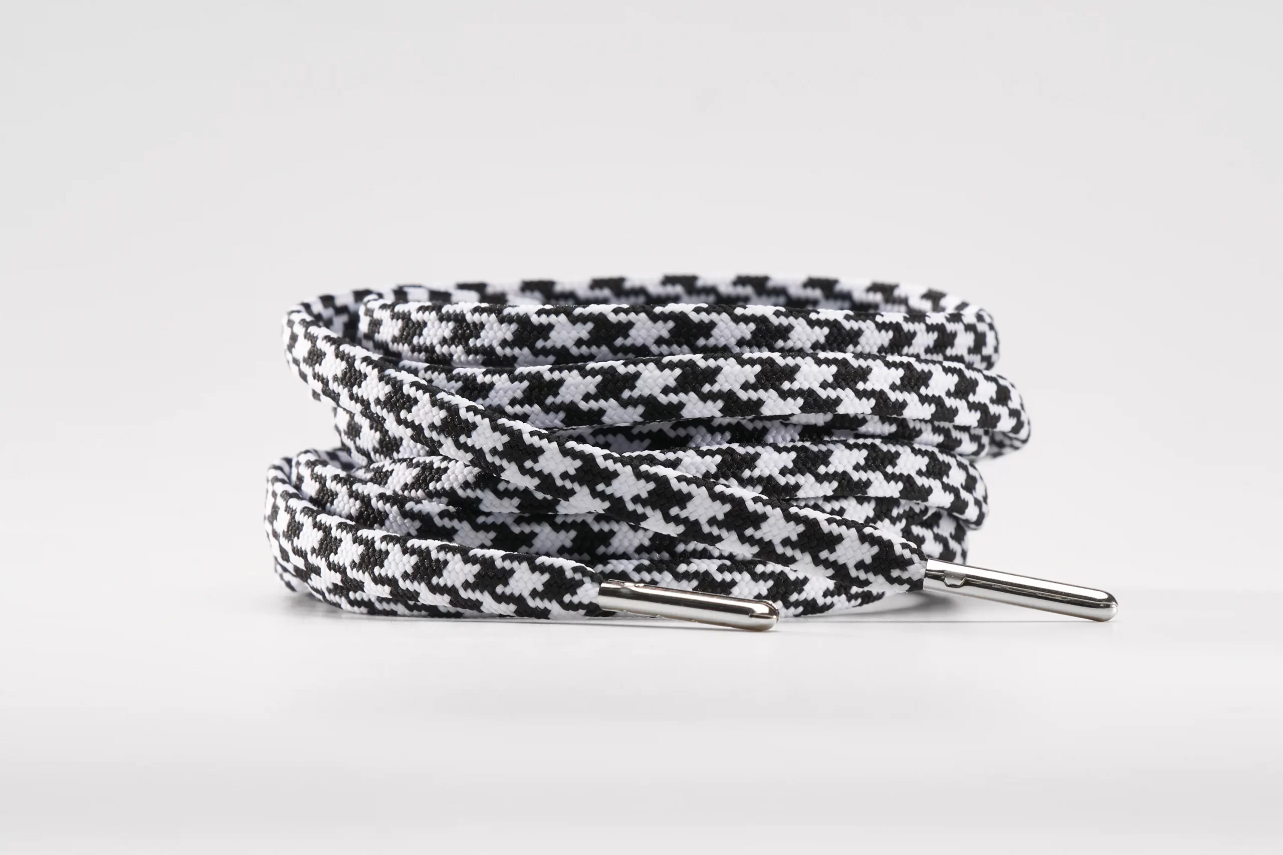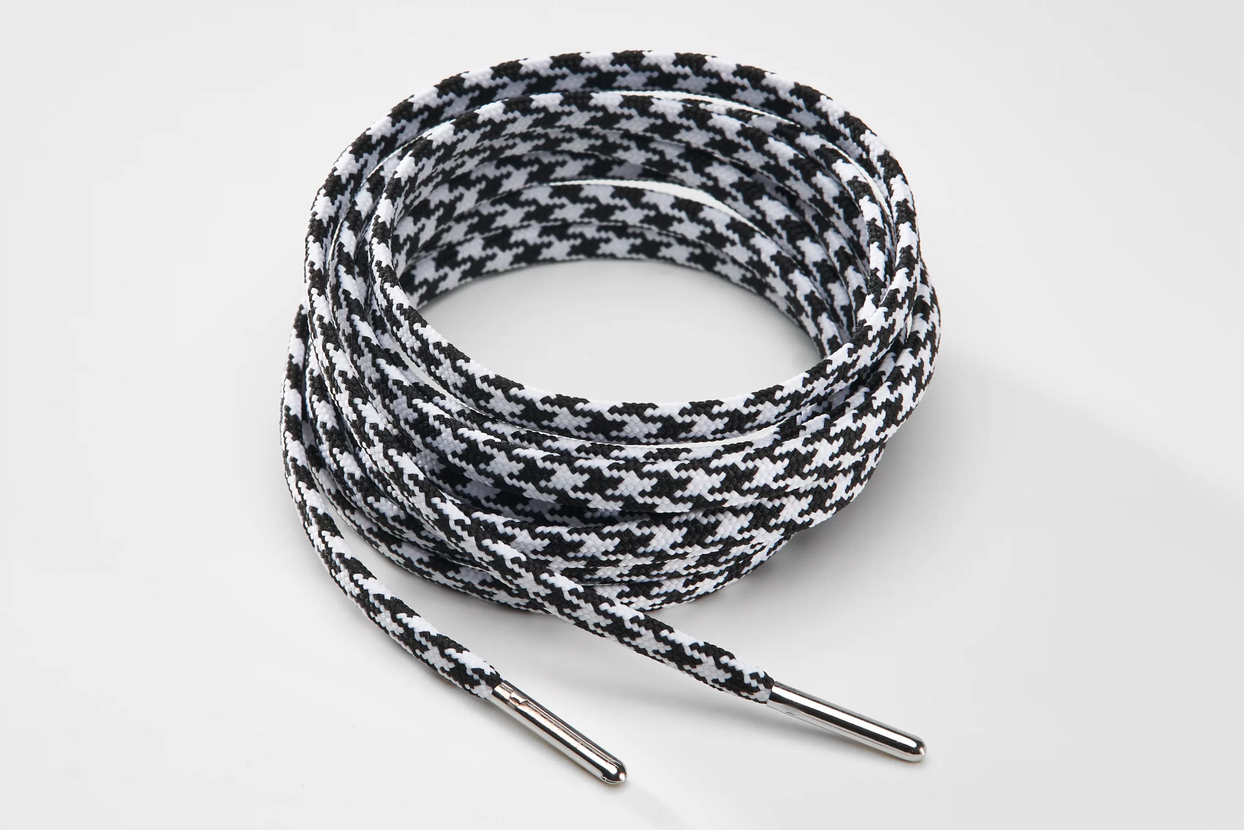 Round durable, high qualitys shoelaces 4mm black with pattern 135cm(54”) for sneakers or boots with 8 holes. The shoelaces come with silver metallic endings.