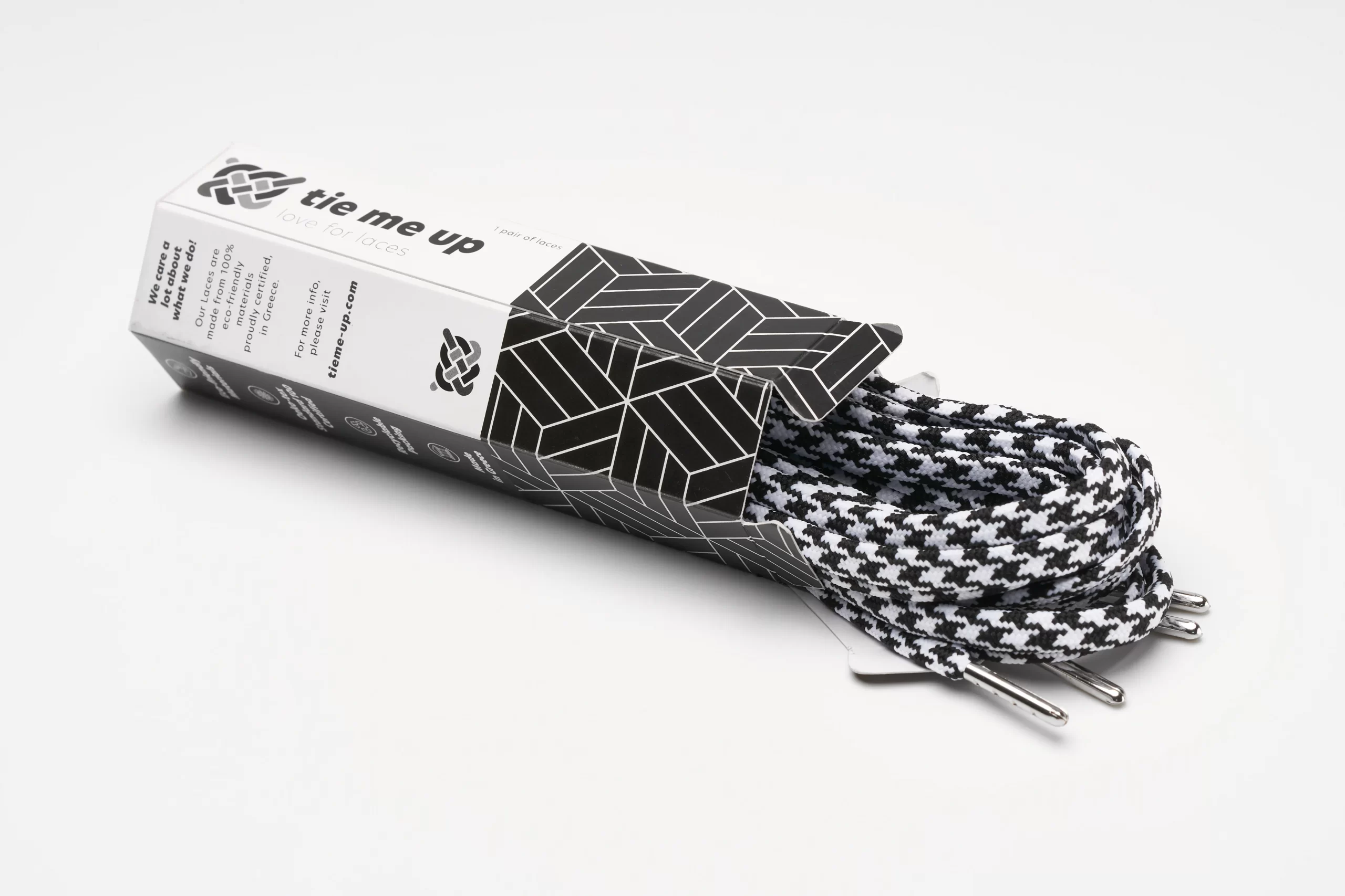 Change your shoelaces with fashion shoeleces from tieme-up and update your style to the next level.Create unique combos that stand out.Its time to complete your own style and tie your shoes up with premium fashion shoelaces.Round shoelaces 4mm black with pattern 135cm(54”).OEKOTEX certified and made in Greece.
