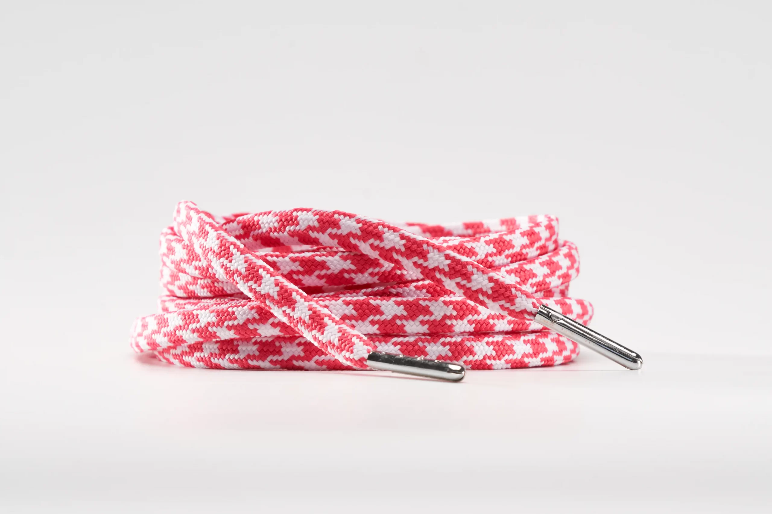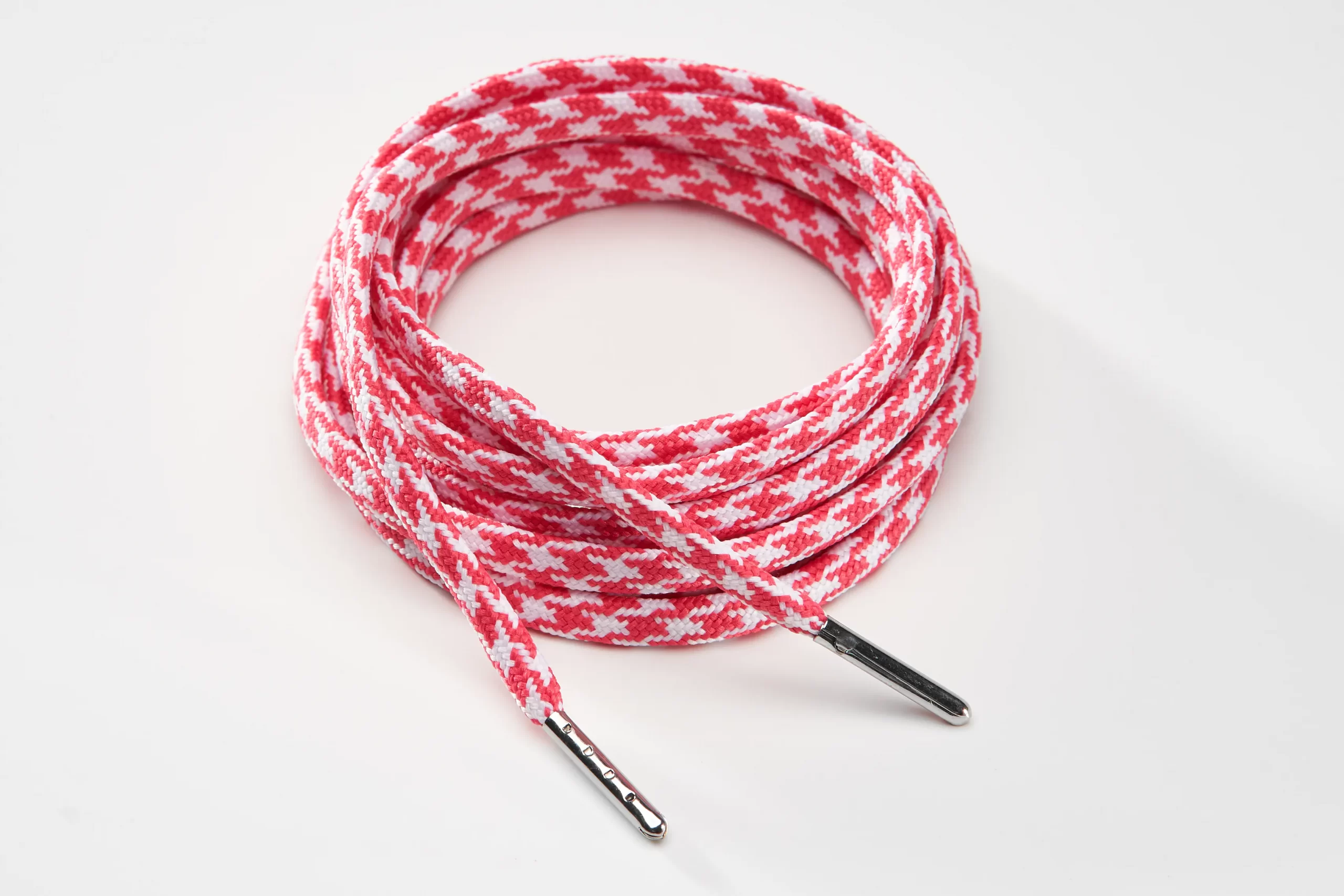 Round durable, high qualitys shoelaces 4mm fuschia with pattern 155cm(61”) for sneakers or boots with 9 holes. The shoelaces come with silver metallic endings.Made of 100% recycled polyester